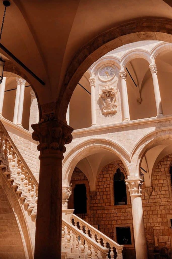 Small courtyard of Rector's Palace with staircase, arches and clock.