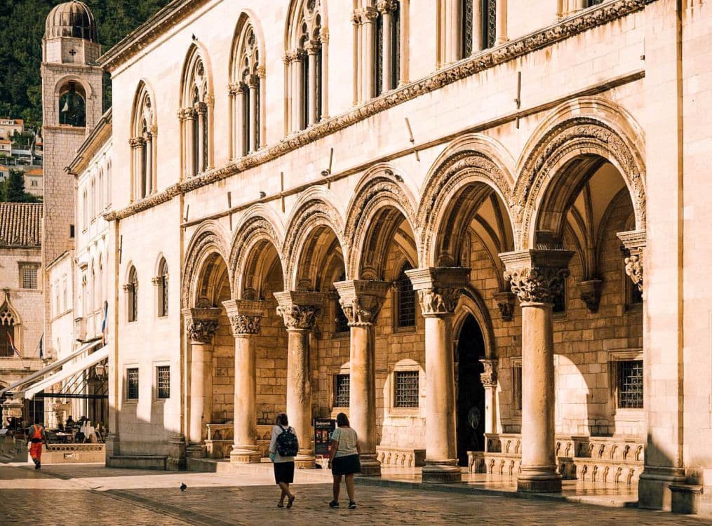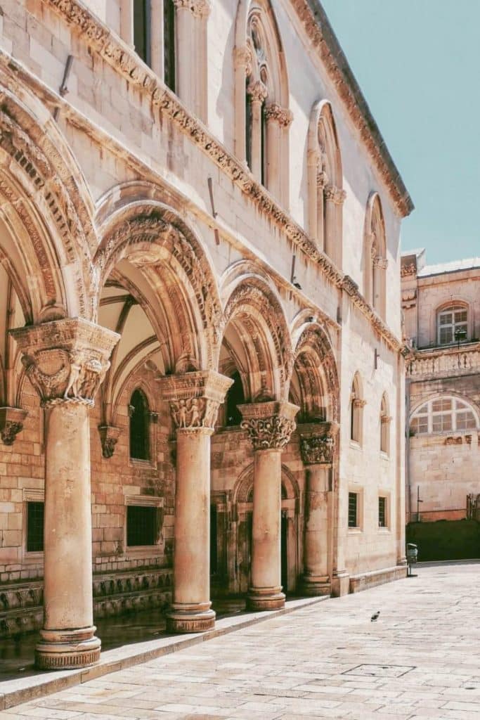 Ornamented arches and pillars of the Rector's Palace portico from Stradun.